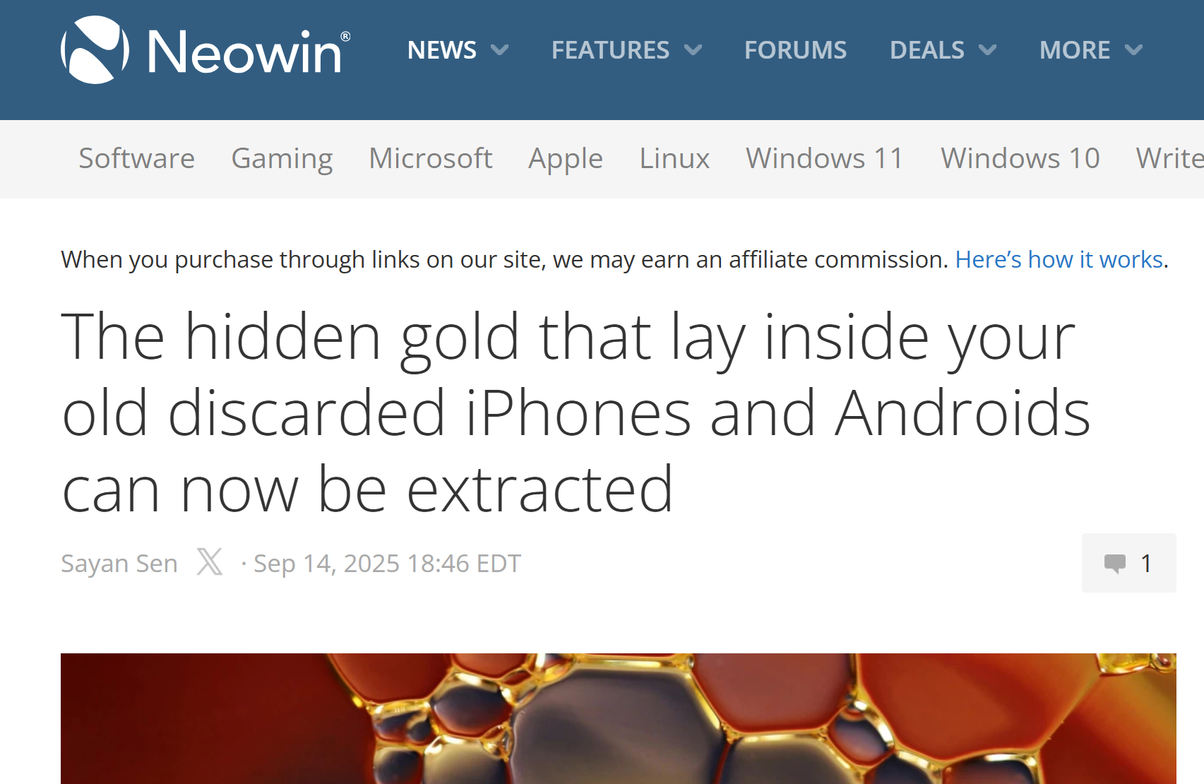 【環球網科技綜合報道】9月15日消息,據科技媒體 NeoWin報道, 澳大利亞弗林德斯大學研究團隊在國際知名期刊《自然・可持續性》發表重要成果,提出一種無需使用氰化物、汞等有害化學物質的新方法,可高效從礦石及電子廢棄物中提取黃金,為解決全球電子垃圾處理難題、推動“城市採礦”發展提供了安全環保的新路徑。