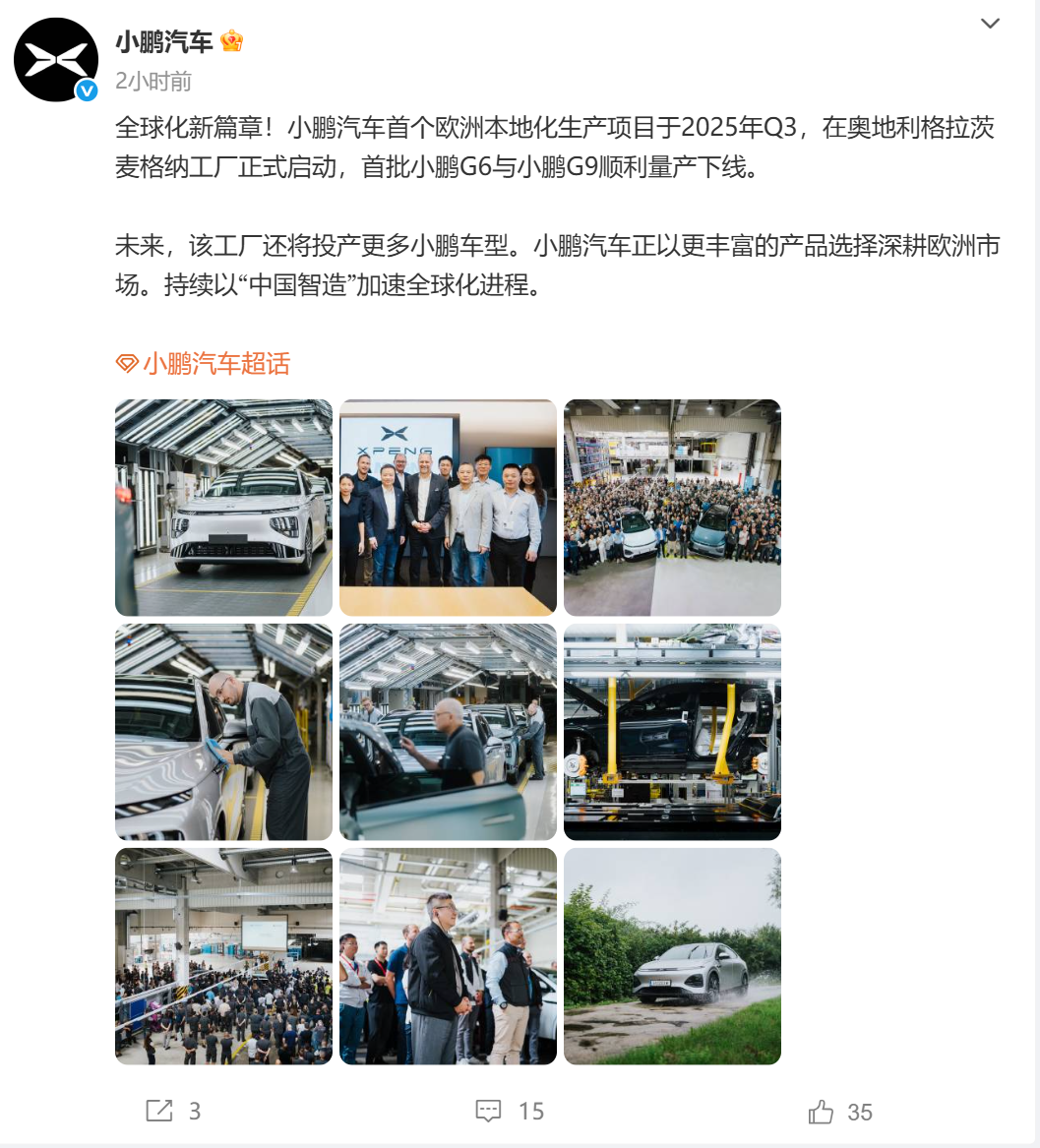 【環球網科技綜合報道】9月15日消息,小鵬汽車近日宣佈其首個歐洲本地化生產項目正式啓動,首批小鵬G6與G9車型在奧地利格拉茨的麥格納工廠順利實現量產下線。