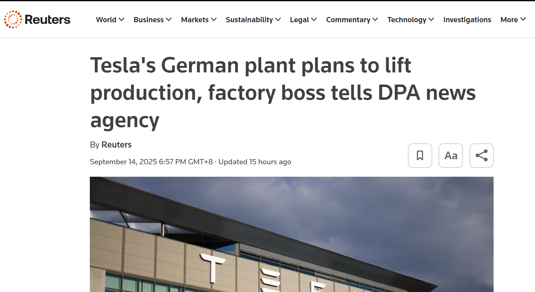 【環球網科技綜合報道】9月15日消息,據路透社報道,特斯拉德國工廠廠長安德烈・蒂裏希(André Thierig)近日透露,受“出色的銷量數據”推動,該工廠將調整生產計劃,比原計劃生產更多電動汽車。