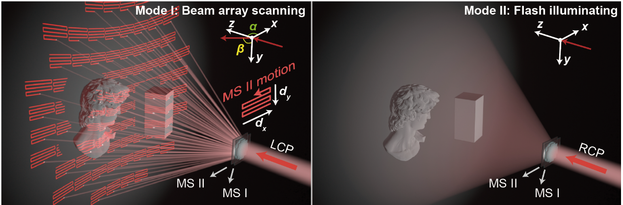 該方案核心在於一種名為“混合級聯平動超表面”的器件,由兩層經過特殊設計的納米鏡片組成。通過改變入射激光的偏振態,系統可以在高精度掃描模式和閃光模式之間自由切換。在掃描模式下,系統能精確捕捉遠處目標的細節;在閃光模式下,則能一次性均勻照亮整個視野,瞬間完成三維成像。