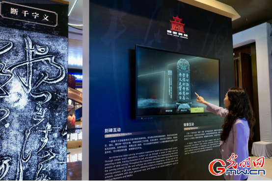 步入精品展古籍展區,一名觀眾正在體驗刻碑互動。只見她手指輕觸屏幕,幾下簡單的操作便完成了選擇碑石、描紅、雕刻等一系列步驟。互動過程中,還伴有石粉飛濺特效,增強真實互動體驗。刻碑完成後,通過掃描屏幕上的二維碼,還能將帶有個人印章的作品圖片保存至手機或分享到社交平台。