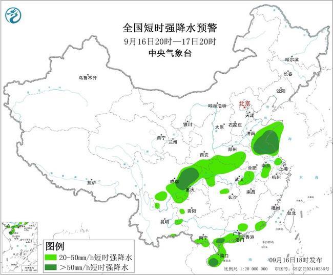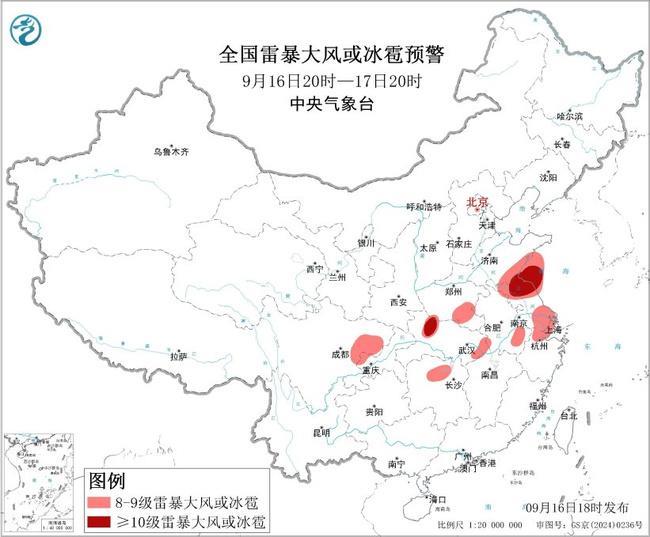 預計9月16日20時至17日20時,黃淮南部、江淮、江漢、江南北部、四川盆地東部等地的部分地區將有8級以上雷暴大風或冰雹天氣,其中,江蘇北部、湖北西北部等地的部分地區將有10級以上雷暴大風;黃淮南部、江淮、江漢、四川盆地、江南北部、華南南部等地的部分地區將有小時雨量大於20毫米的短時強降水天氣,其中,山東中東部和南部、安徽北部、江蘇中北部、四川東部、重慶西部、廣東西南部、海南島等地的部分地區小時雨量大於50毫米,最大可達70毫米以上。