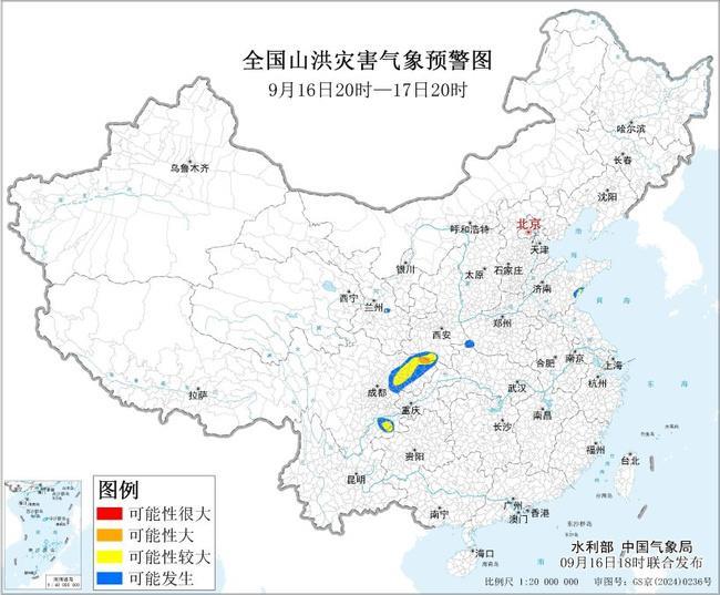 預計,9月16日20時至17日20時,山東東南部、四川東部、雲南東北部、陝西南部、甘肅南部等地部分地區發生山洪災害可能性較大(黃色預警),其中,四川東北部、陝西南部等地部分地區發生山洪災害可能性大(橙色預警)。其他地區也可能因局地短歷時強降水引發山洪災害,請各地注意做好即時監測、防汛預警和轉移避險等防範工作。