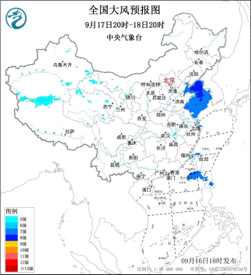 9月17日20時至18日20時,西藏北部、甘肅河西將有5~6級風,陣風7~8級;渤海海峽、黃海大部海域將有7~8級、陣風9級的大風。