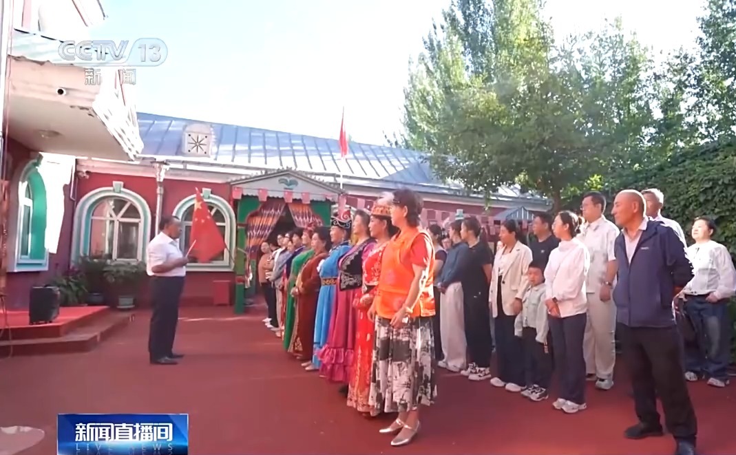 *新疆塔城市新城街道哈爾墩社區居民 沙勒克江·依明:*原來沒升過國旗,怎麼升?國歌音樂兩個配合起來,一定要把它熟練。第一次早晨升國旗的時候,突然我兩個腿就軟了。五星紅旗,給我力量,一邊升我一邊哭。從那開始,我就説我有兩個媽媽,一個媽媽就是我的親生媽媽給了生命。第二個媽媽就是我的祖國媽媽。