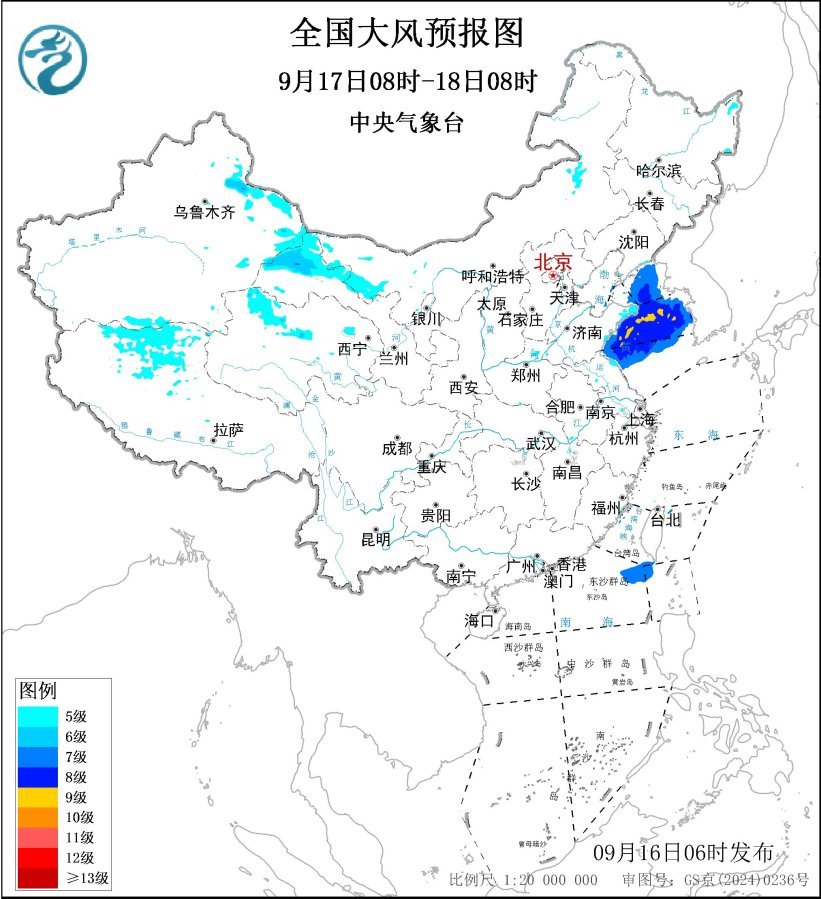 預計,9月16日8時至17日8時,新疆東部及南疆盆地、甘肅河西、青海北部、內蒙古西部和中東部、東北地區西部、山東半島等地部分地區有5級、陣風7級的大風,其中,內蒙古東北部的部分地區風力可達7級、陣風9級;渤海、渤海海峽、黃海北部和中西部海域將有7~8級、陣風9級的大風,其中黃海中西部的部分海域風力可達9~10級、陣風11級。