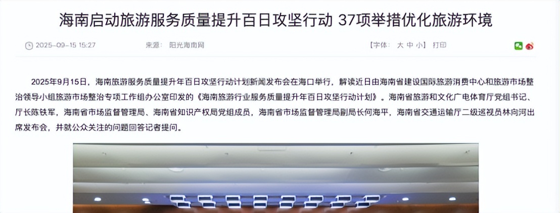 【環球網財經綜合報道】9月15日,海南省旅遊服務質量提升年百日攻堅行動計劃新聞發佈會在海口市召開。為全面提升旅遊服務質量,回應遊客關切,海南省決定自9月8日至12月18日開展旅遊服務質量提升年百日攻堅行動,圍繞十大行動方向,細化多項重點攻堅任務,通過多措並舉推動旅遊服務全面升級。