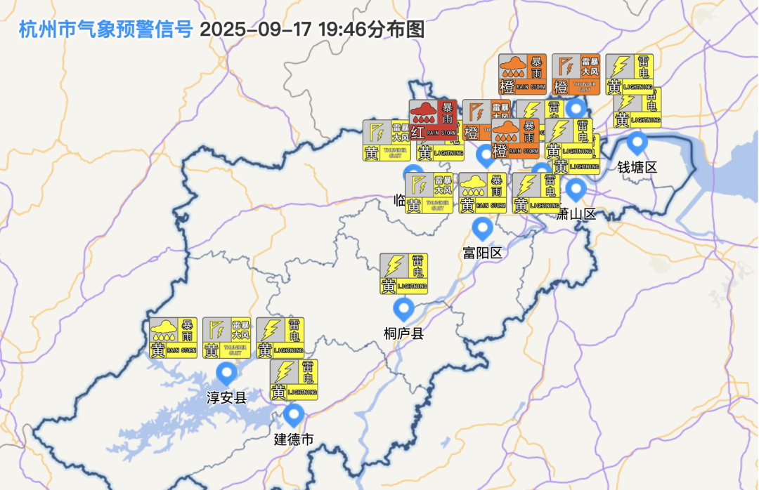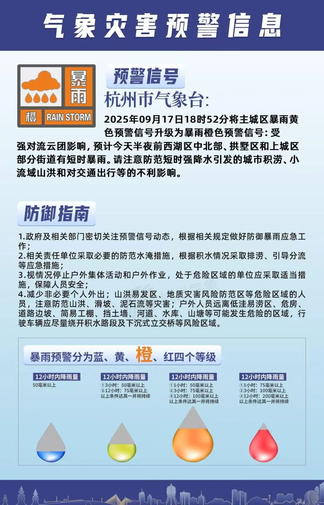 杭州市氣象台2025年09月17日18時52分將主城區暴雨黃色預警信號升級為暴雨橙色預警信號:受強對流雲團影響,預計今天半夜前西湖區中北部、拱墅區和上城區部分街道有短時暴雨。請注意防範短時強降水引發的城市積澇、小流域山洪和對交通出行等的不利影響。