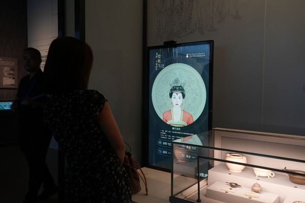 李倕冠飾是中國第一個通過實驗室微觀發掘科學復原的冠飾,在一旁的電子互動屏上,其細節能夠逐一放大欣賞。若有觀者希望“上頭”體驗一把大唐遺風,現場拍照、等待數秒,人工智能就會發來形象逼真的“古裝照”。