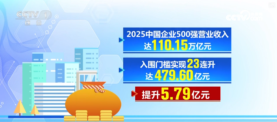 2025中國企業500強營業收入達110.15萬億元,入圍門檻實現23連升,達479.60億元,提升5.79億元;實現歸屬母公司所有者淨利潤總額4.71萬億元,增長4.39%。