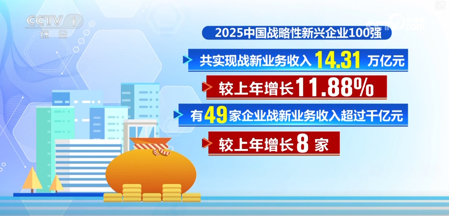 此次同步發佈的中國企業500強榜單還包括戰略性新興產業100強等一系列專項榜單。2025中國戰略性新興企業100強,共實現戰新業務收入14.31萬億元,較上年增長11.88%。有49家企業戰新業務收入超過千億元,較上年增長8家。
