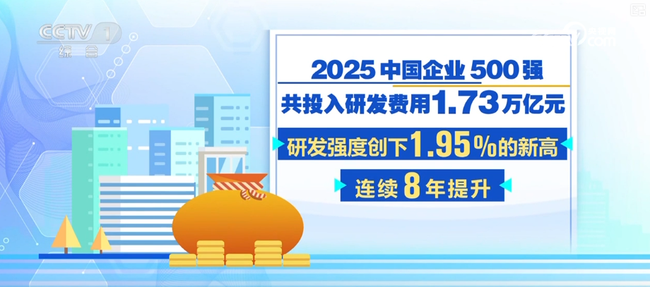2025中國企業500強共投入研發費用1.73萬億元,研發強度創下1.95%的新高,連續8年提升。研發強度前10名有5家企業來自通信設備製造業,有8家企業為民營企業。