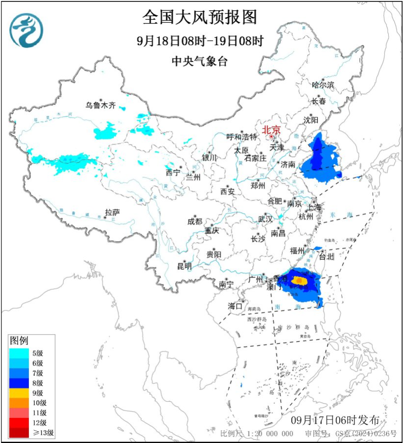 9月18日08時至19日08時,新疆東部、甘肅河西、西藏北部等地部分地區有5~6級風,陣風7~8級;黃海大部海域、台灣海峽南部將有7~8級、陣風9級的大風,南海東北部海域將有9~10級、陣風11~12級的大風。