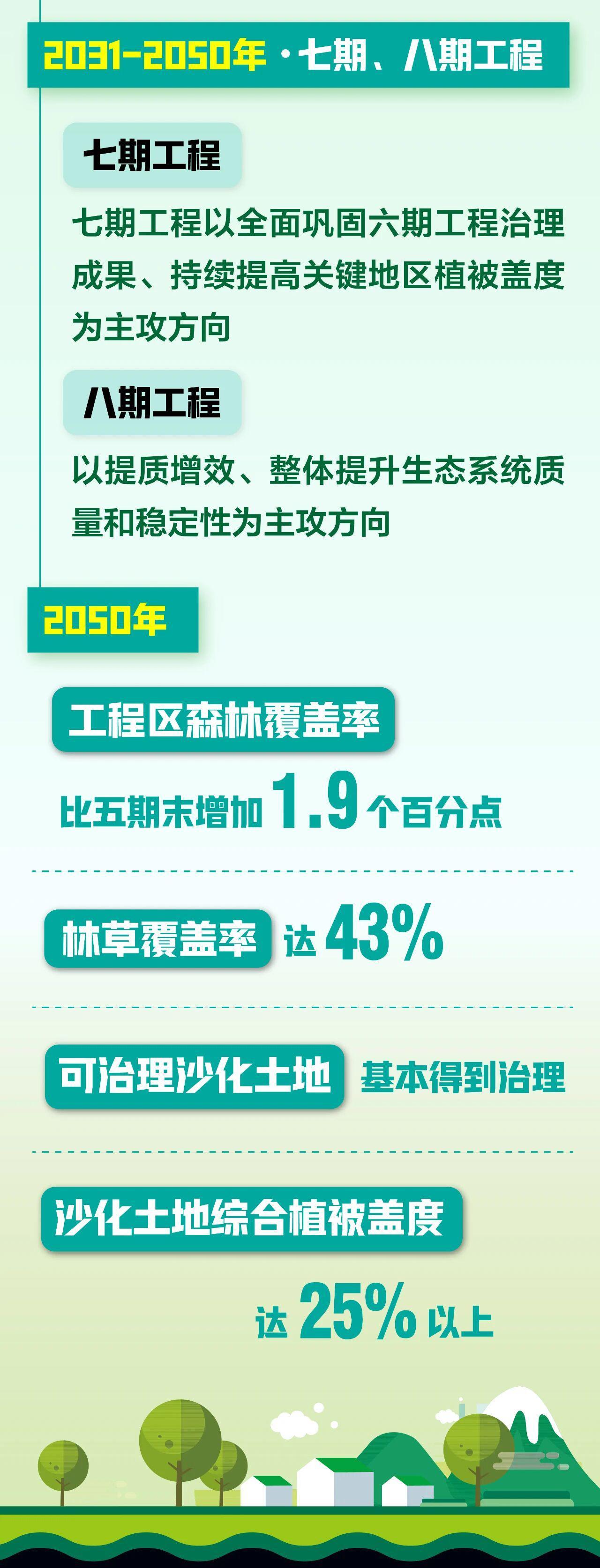 2031-2050年為七期、八期工程。其中,七期工程以全面鞏固六期工程治理成果、持續提高關鍵地區植被蓋度為主攻方向;八期工程以提質增效、整體提升生態系統質量和穩定性為主攻方向。