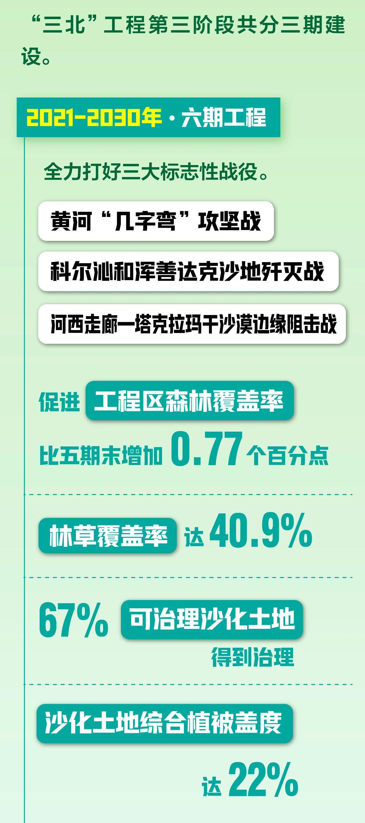 《規劃》明確,“三北”工程第三階段共分三期建設。其中,2021-2030年為六期工程,將全力打好黃河“幾字彎”攻堅戰、科爾沁和渾善達克沙地殲滅戰、河西走廊-塔克拉瑪干沙漠邊緣阻擊戰等三大標誌性戰役,促進工程區森林覆蓋率增加0.77個百分點(有關目標及任務基期均為五期工程末,下同),林草覆蓋率達40.9%,67%可治理沙化土地得到治理,沙化土地綜合植被蓋度達22%。