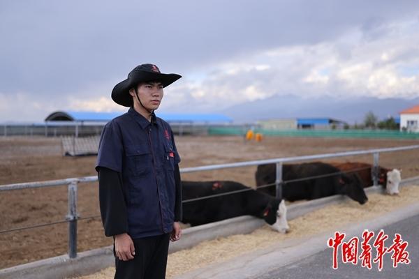 9月10日,新疆博爾塔拉蒙古自治州博樂市,新疆天萊農牧集團股份有限公司養殖場,20歲的撇依力·葉爾加義在牛欄前。他是伊犁哈薩克自治州新源縣人,在伊犁職業技術學院畜牧獸醫專業就讀,明年即將畢業。通過校企合作政策,加上自身的專業興趣,他來到該公司實習,他認為這裏的工作環境很適合自己,未來打算留下。中青報·中青網記者 曲俊燕/攝