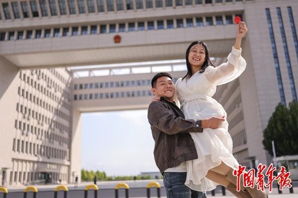 9月9日,新疆伊犁哈薩克自治州霍爾果斯公路口岸第六代國門前,一對來自山西晉中的新婚夫婦手持“囍”字拍攝蜜月紀念照。霍爾果斯公路口岸是我國西部通關歷史最長、綜合運量最大、自然環境最好、功能最齊全的國家一類陸路口岸,設計年貨運通關能力300萬噸,出入境人員500萬人次。目前,共有40多個國產汽車品牌的不同車型從霍爾果斯公路口岸出關。第六代國門(南部聯檢區)於2018年9月27日正式啓用,除了承載繁忙的海關功能,如今更成為各地遊客的旅遊打卡點。 中青報·中青網記者 曲俊燕/攝