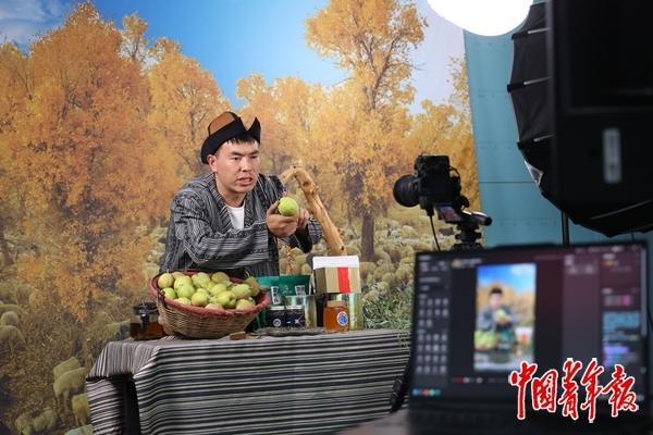 9月9日,新疆巴音郭楞蒙古自治州尉犁縣直播基地,24歲的喀比力·喀地爾正在直播帶貨,銷售香梨、羅布麻原葉等當地特產。該基地2024年實現銷售額1.7億元,成為全疆名優特產品線上集中展示的窗口。其中,年輕人扛起了疆貨出疆的大旗,尉犁縣電子商務協會牽頭的直播隊伍中,主播的平均年齡約26歲。中青報·中青網記者 王鑫昕/攝