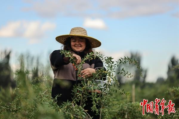9月11日,新疆博爾塔拉蒙古自治州精河縣吾夏克巴依西村,地麗努爾在採摘枸杞。她來自鄰村永集湖村,每年夏秋兩季來這裏摘枸杞。吾夏克巴依西村是精河縣枸杞核心種植區,自20世紀70年代開始種植枸杞,全村現有枸杞種植面積4600畝。通過產業鏈延伸和技術升級,該村枸杞產業產值大幅提升,帶動村民人均收入增加近1000元,採摘季為周邊提供大量季節性就業崗位。中青報·中青網記者 曲俊燕/攝