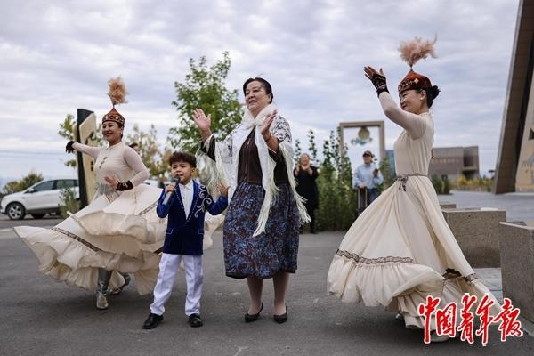 9月13日,新疆塔城地區額敏縣也迷裏文化園,身着民族服飾的當地人用歌舞迎接來參觀的客人。中青報·中青網記者 曲俊燕/攝