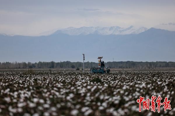 9月11日,新疆博爾塔拉蒙古自治州精河縣夏爾託熱村,棉花即將迎來豐收,一名農户將田邊的太陽能殺蟲燈取下,留待明年繼續使用。中青報·中青網記者 曲俊燕/攝