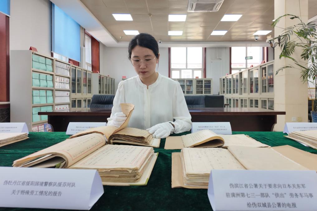 黑龍江省檔案館工作人員展示此次展出的檔案。新華社記者何山 攝