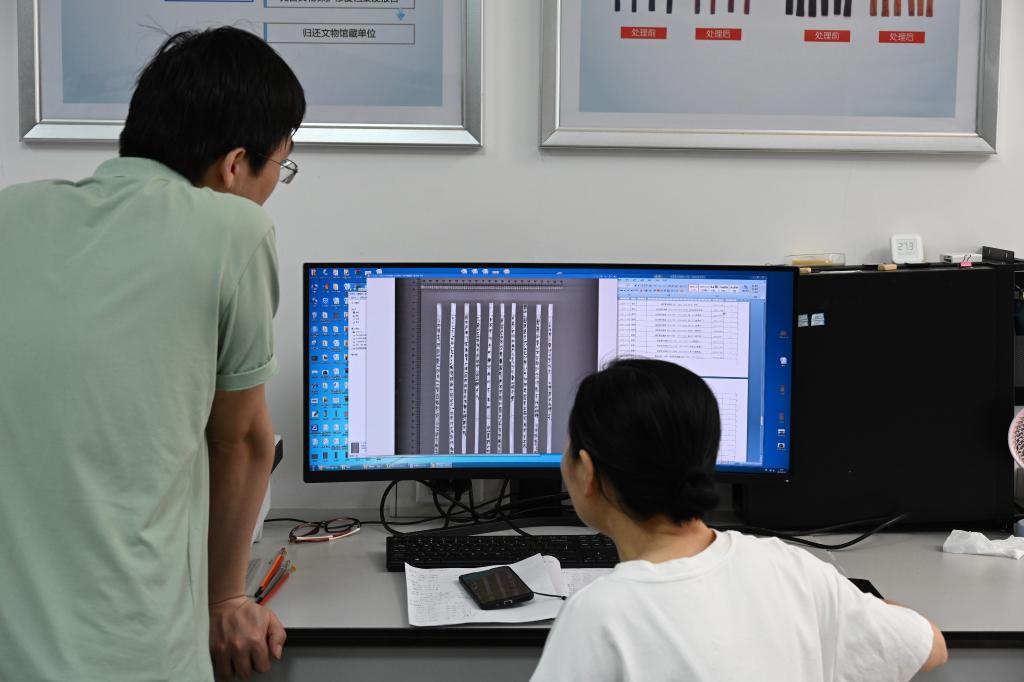 在荊州文物保護中心,工作人員檢查掃描後的竹簡文字。新華社記者黃曉勇 攝