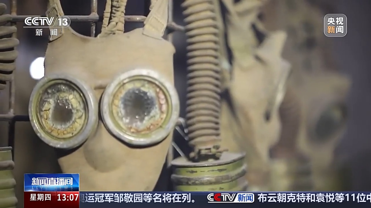 *侵華日軍第七三一部隊罪證陳列館副館長 張陽:*這些防毒面具就是從哈爾濱市平房區徵集而來,它是人面造型,然後在鼻子處有軟管,下面是空氣過濾器。他們進行實驗的時候,七三一部隊隊員為了不被感染都要使用這樣的防毒面具。