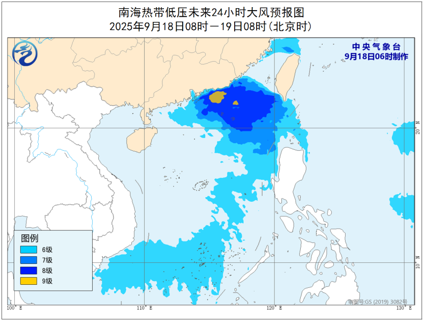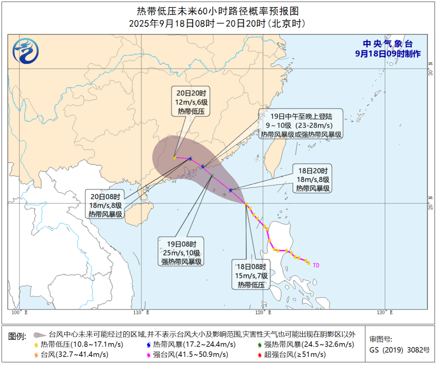 另外,菲律賓附近的熱帶低壓昨天夜間移入南海北部海面,今天(18日)早晨8點鐘其中心位於廣東省汕尾市東南方約465公里的海面上,預計該熱帶低壓將以每小時15至20公里的速度向西北方向移動,強度逐漸增強,將於今天加強為編號颱風,逐漸向廣東中東部一帶沿海靠近,並將於19日中午至晚上在上述沿海登陸(23至28米/秒,9至10級,熱帶風暴級或強熱帶風暴級),登陸後繼續向西北方向移動,強度逐漸減弱。