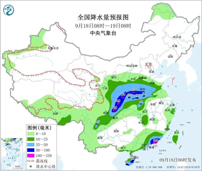 中央氣象台9月18日06時繼續發佈暴雨黃色預警: