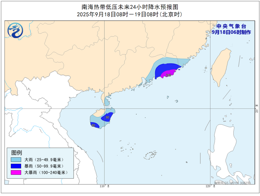 降水**預報:18日08時至19日08時,福建南部、廣東東部和西南部沿海、海南島等地有大到暴雨,其中,廣東東南部沿海部分地區有大暴雨(100-240毫米)。