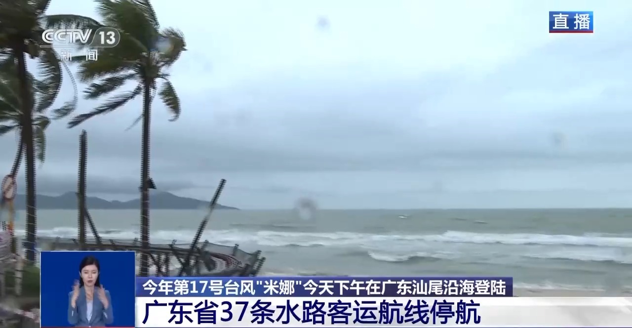 總枱記者 成穎傑:我現在的位置是汕尾市金町灣旅遊度假區,在今天下午2點50分左右,今年第17號颱風“米娜”登陸在了汕尾城區的附近。