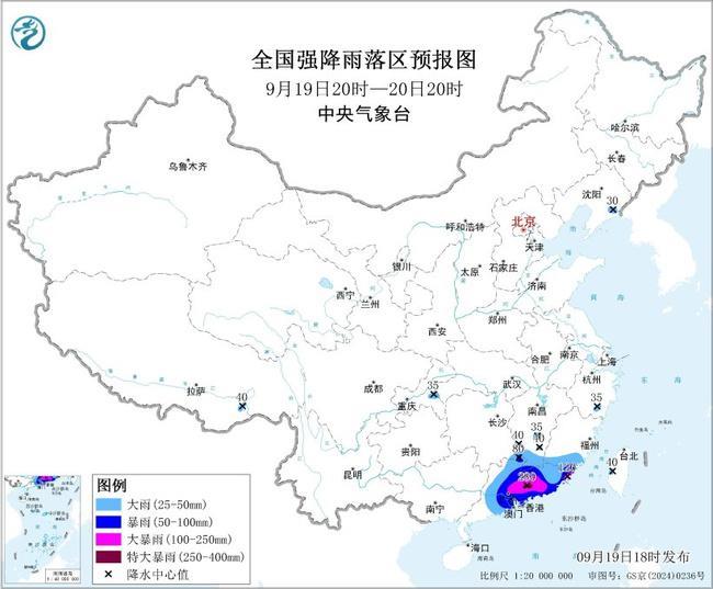 預計,9月19日20時至20日20時,福建南部、廣東中東部、江西南部以及浙江南部、台灣島西部、重慶中部偏東、遼寧東南部等地有大雨或暴雨,其中,廣東中東部、福建東南部等地的部分地區有大暴雨,局地有特大暴雨(250~280毫米)。上述部分地區伴有短時強降水(最大小時降雨量40~60毫米,局地可超過80毫米),局地有雷暴大風等強對流天氣。