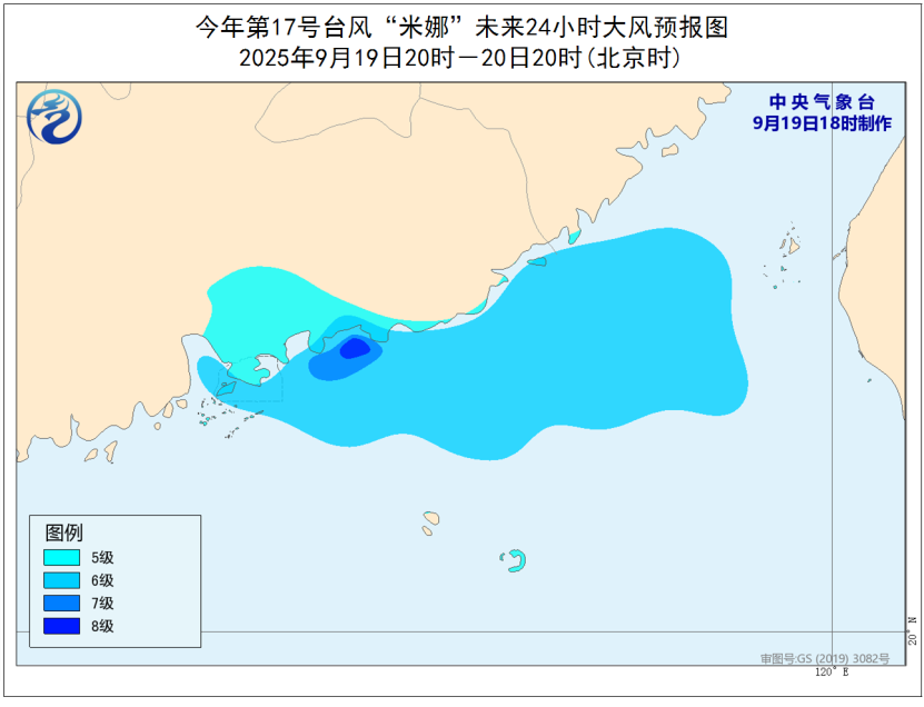 大風預報:19日20時至20日20時,南海東北部、福建南部沿海、廣東中東部沿海將有6-7級、陣風8級的風,部分海域風力可達8級、陣風9-10級。