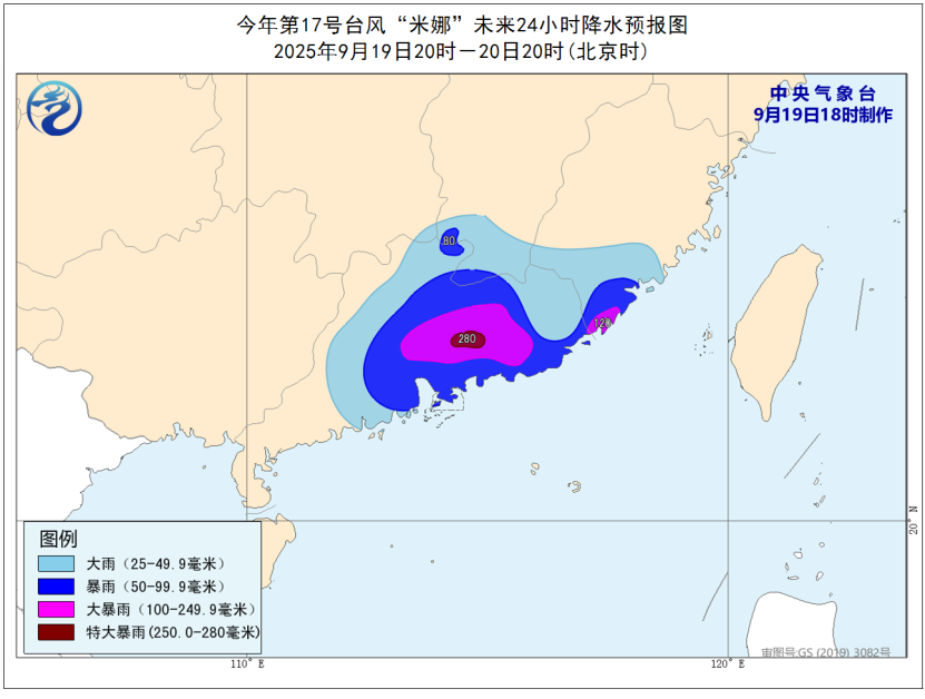 降水預報:19日20時至20日20時,福建南部、廣東中東部、江西南部有大雨或暴雨,其中,廣東中東部、福建東南部等地的部分地區有大暴雨,局地有特大暴雨(250-280毫米)。