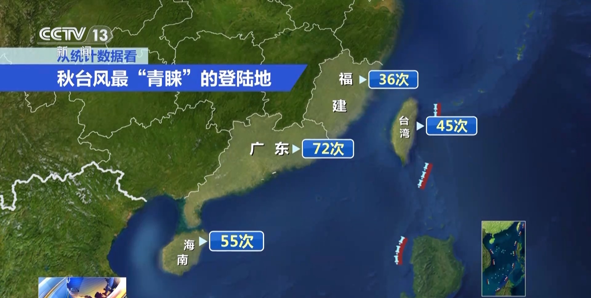 秋颱風最“青睞”的登陸地為廣東省、海南省、台灣省和福建省。1949年至2023年,共有185個颱風在秋季登陸我國,其中9月最多,為128個,10月有46個,而處於深秋的11月也有11個颱風登陸。從統計數據看,秋颱風最“青睞”的登陸地為廣東(72次)、海南(55次)、台灣(45次)和福建(36次)。
