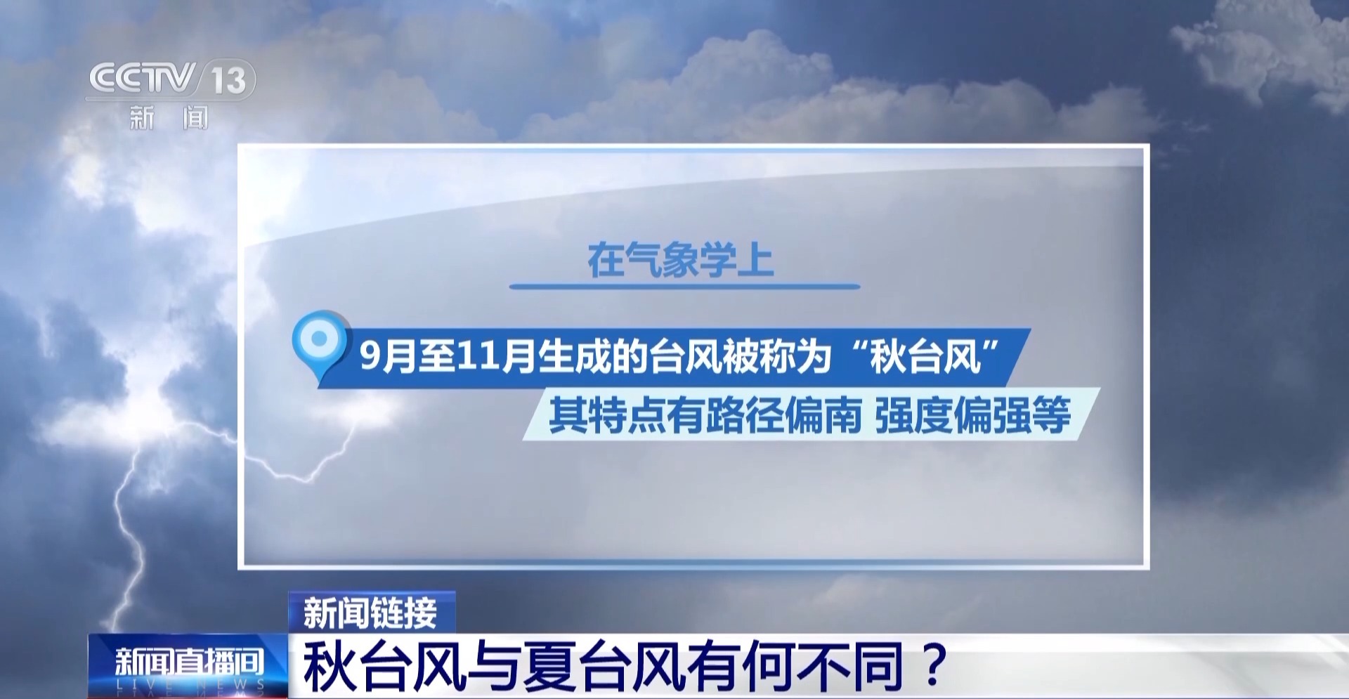 在氣象學上,9月至11月生成的颱風被稱為“秋颱風”,其特點有路徑偏南、強度偏強等。從常年平均來看,6至8月的夏季颱風,平均每年生成11.07個,其中有4.73個登陸我國。9至11月的秋季颱風,平均每年生成10.7個,其中有2.33個登陸我國。秋颱風從生成數量上雖然與夏颱風基本持平,但登陸我國的秋颱風比夏颱風明顯偏少。