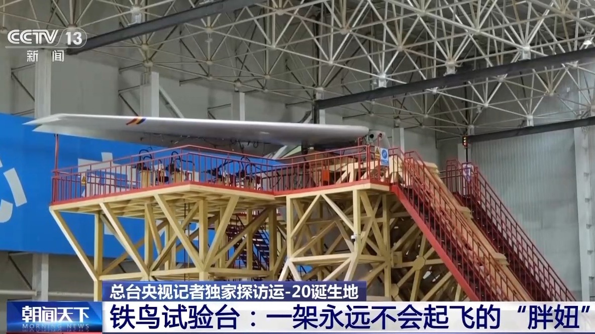 *總枱央視記者 崔霞:*我身後巨型的鋼鐵支架,叫“鐵鳥試驗枱”,它就像一架被拆解的飛機骨架。就是這個鋼鐵巨人,托起了“胖妞”運-20。