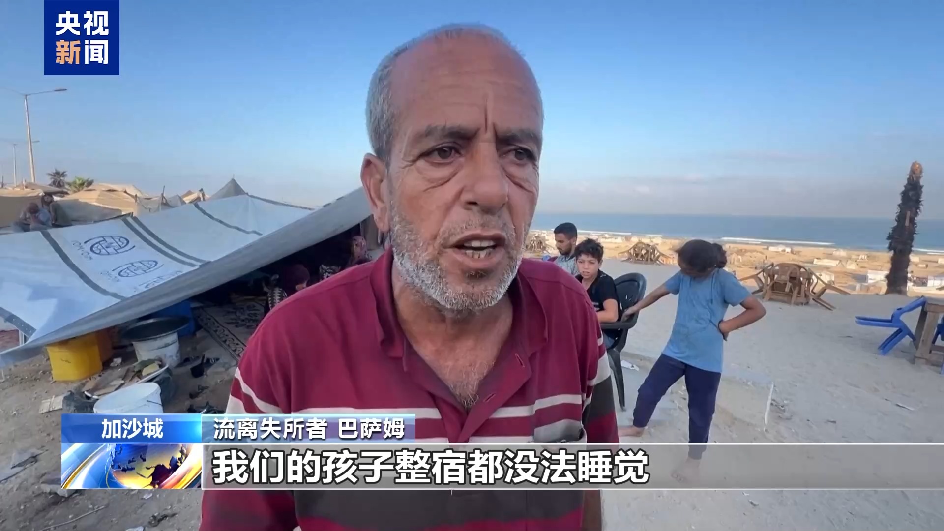 *流離失所者 巴薩姆:*因為不停的炮擊和轟炸,我們的孩子整宿都沒法睡覺。我們住在沙灘上,以軍的船隻在開火,戰機在轟炸,坦克在炮擊。我們很害怕,但是我們能怎麼辦呢?