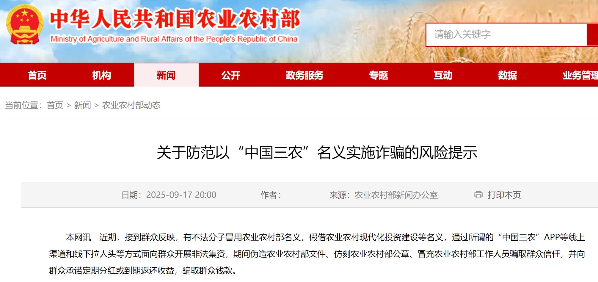 對此,農業農村部向社會公眾作出如下風險提示:農業農村部從未以制發文件、派出人員等形式參與或推廣“中國三農”APP等投資收益類活動,相關文件和公章均非我部正式印發的文件或合規使用的印章,“中國三農”APP及其相關網址和相關組織人員,均與農業農村部無任何關聯,請廣大羣眾提高警惕,加強甄別,謹防上當受騙。當前,鄉村振興受到社會高度關注,一些不法分子趁機實施詐騙等違法犯罪活動,請廣大羣眾知曉,農業農村部不會面向羣眾借用或徵用資金,不會面向羣眾開展投資理財活動,不會通過發文件、派人員等方式誘導羣眾參與各類投資理財類活動。(青雲)