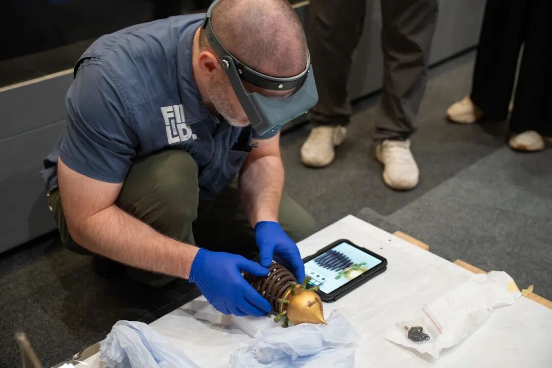 現場,美國菲爾德自然史博物館文物保管員丹尼爾·卡平帶領工作人員開箱檢查,並將木塔模型放入特製展櫃,等待一場期待已久的見面。