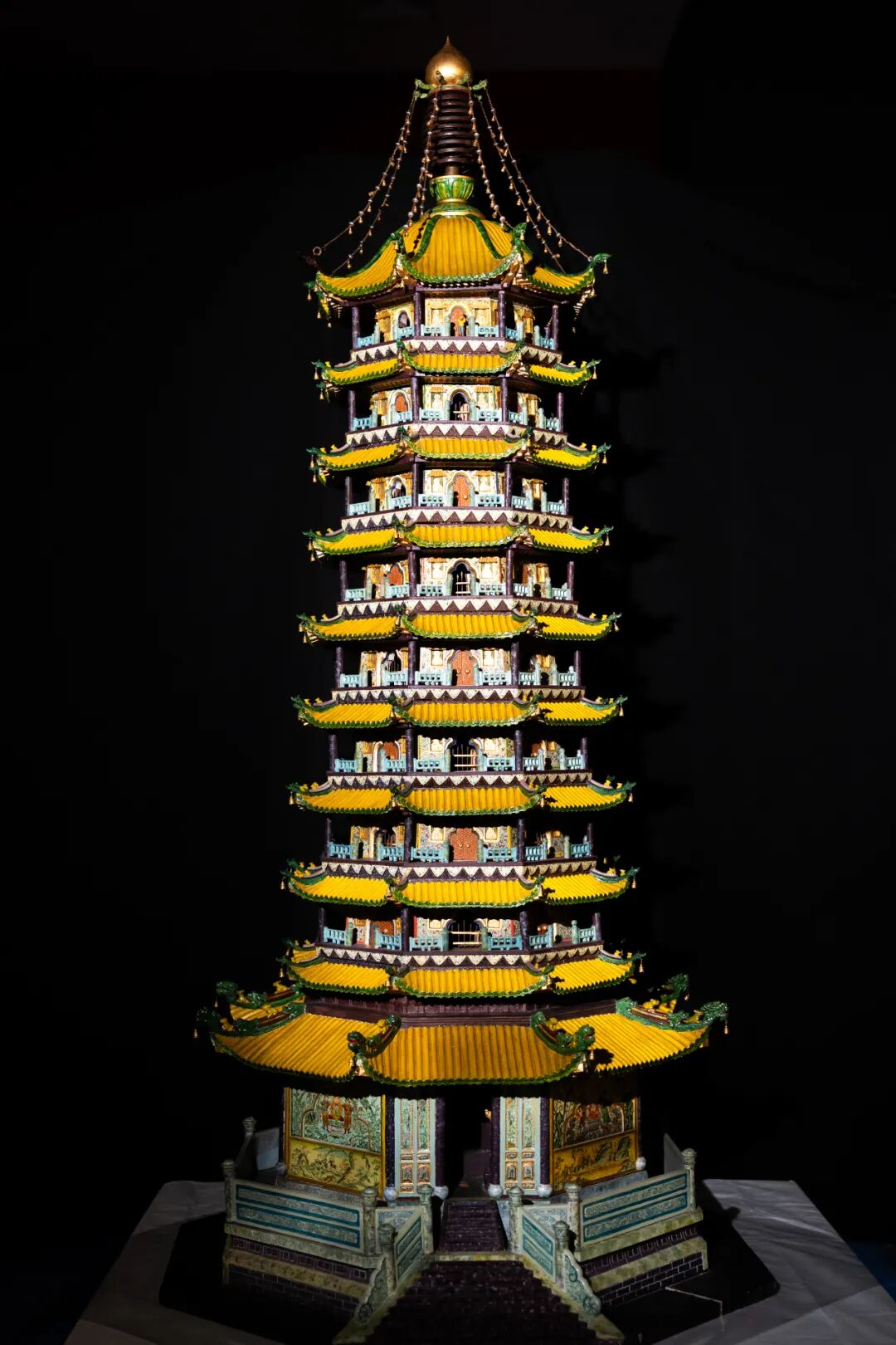 這些模型中,體量最大、顏色最鮮豔、最吸引人的,就是大報恩寺琉璃塔模型。“製作的時候,琉璃塔已經毀於戰火,於是他們以清代嘉慶年間《江南報恩寺琉璃寶塔全圖》版畫為藍本,並加上自己對於南京瓷塔的理解和想象,復原了這座1856年毀於戰火的琉璃塔。”王文溪介紹,這是琉璃塔被毀後的首次模型復原,為後人提供了珍貴的參考資料。
