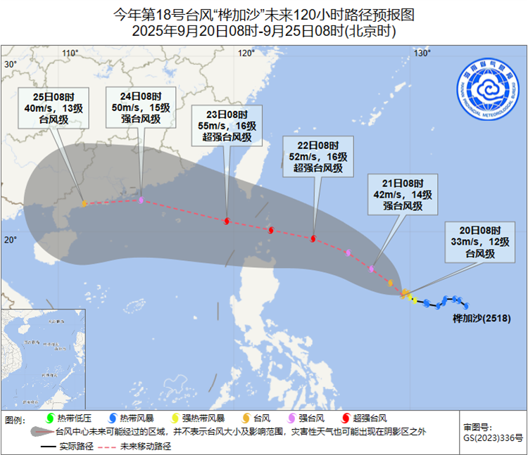 颱風“樺加沙”將於22日夜間至23日早晨進入南海,之後趨向廣東中西部沿海,最強可達超強颱風級,瓊州海峽將出現較長時間停航,請相關部門提前做好通航安排,在南海北部、中部作業的海上平台和船隻需做好避風準備。