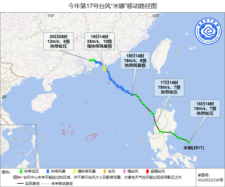 9月16日下午,菲律賓以東的熱帶擾動加強為熱帶低壓,之後向西北方向移動,於17日早晨在菲律賓馬尼拉呂宋島東部沿海登陸,並於17日夜間移入南海北部海面,18日14時加強為今年第17號颱風“米娜”(熱帶風暴級;英文名稱:MITAG;名字來源:密克羅尼西亞;意義:女士名,意為“我的眼睛”(雅浦語)),19日14時50分前後在廣東省汕尾市沿海登陸,登陸時中心附近最大風力有10級(25米/秒),19日23時在廣東境內減弱為熱帶低壓,20日08時中央台對其停止編號。