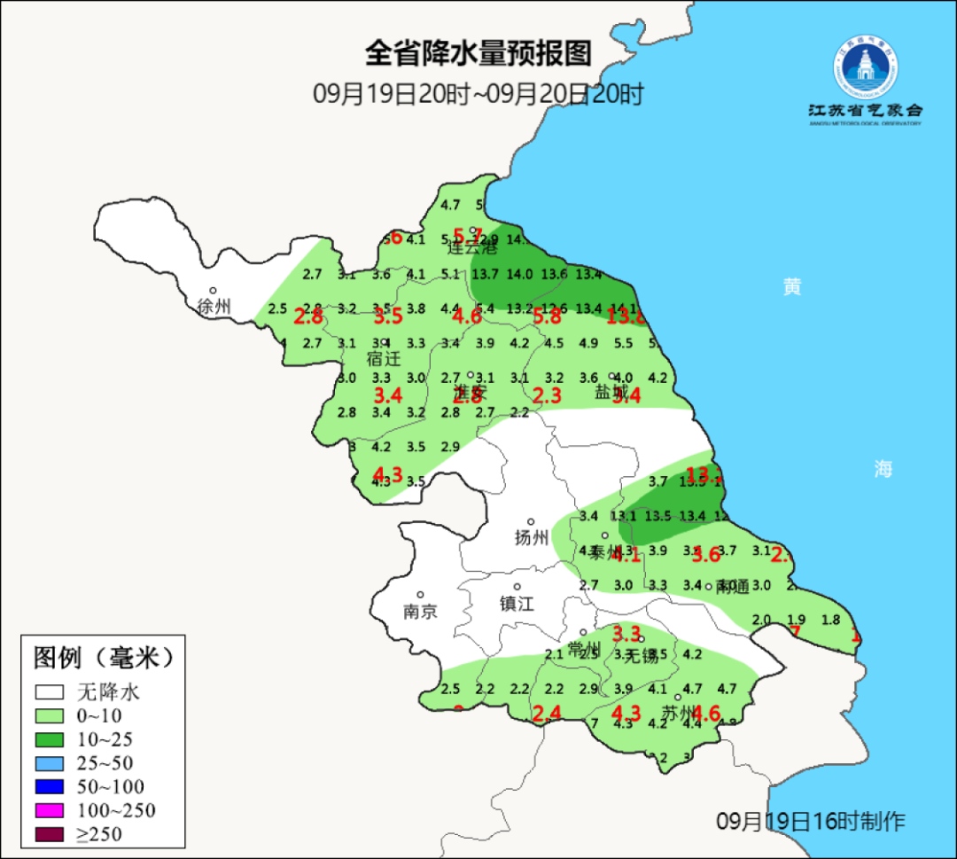 今天夜裏江淮之間和淮北地區陰有陣雨或雷雨並漸止,局部雨量中等;其他地區多雲到陰,局部有陣雨。明天白天蘇南南部地區多雲到陰,局部有陣雨,其他地區陰轉多雲。最高温度:淮北地區24~25℃,其他地區27℃左右;最低温度:淮北地區13~14℃,本省東南部地區23℃左右,其他地區19℃左右。全省偏北風轉東北風,風力都是4級陣風5—6級。