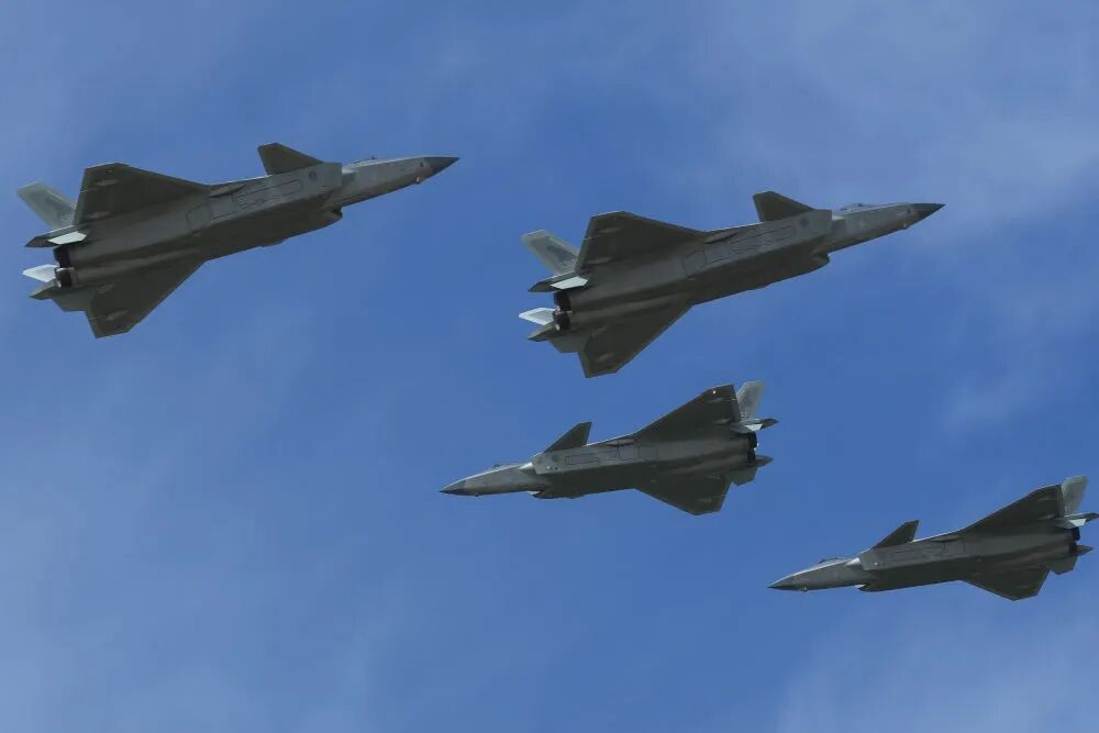 9月19日,殲-20編隊進行機動飛行展示。新華社記者 顏麟藴 攝