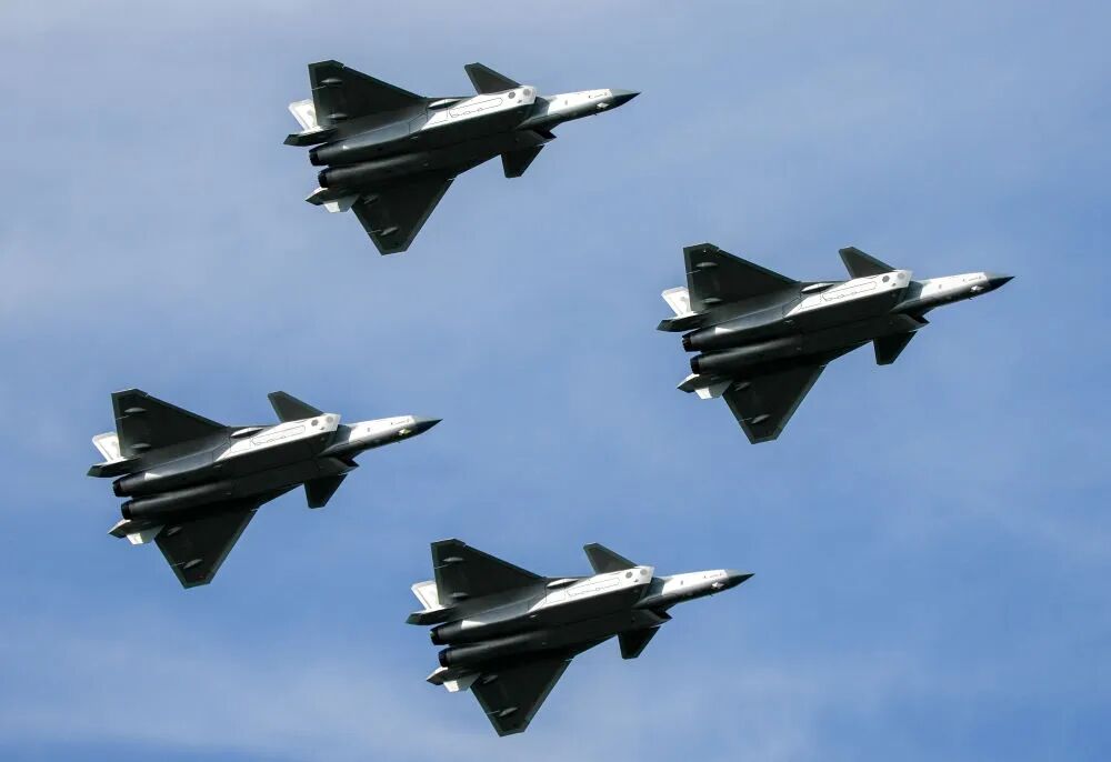 9月19日,殲-20四機編隊進行機動飛行展示。新華社記者 顏麟藴 攝
