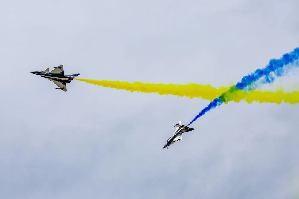 9月19日,2025年空軍航空開放活動和長春航空展上,殲-16進行雙機機動飛行展示。新華社記者 張楠 攝