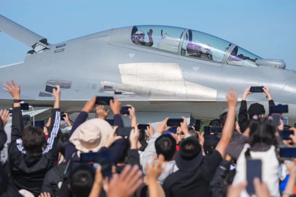 9月19日,殲-16飛行員在完成表演後向觀眾揮手致意。新華社記者 顏麟藴 攝