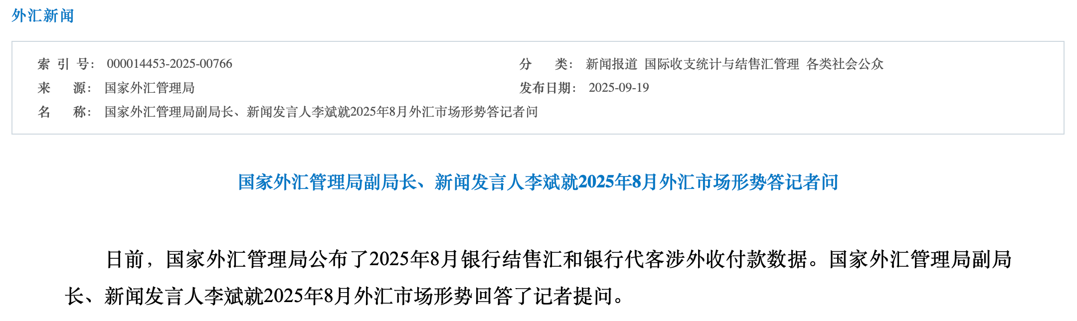 【環球網財經綜合報道】9月19日,國家外匯管理局公佈2025年8月銀行結售匯和銀行代客涉外收付款數據。國家外匯管理局副局長、新聞發言人李斌在同日舉行的新聞發佈會上表示,8月我國外匯市場運行平穩,交易保持活躍,市場供求總體平衡,市場預期穩定。